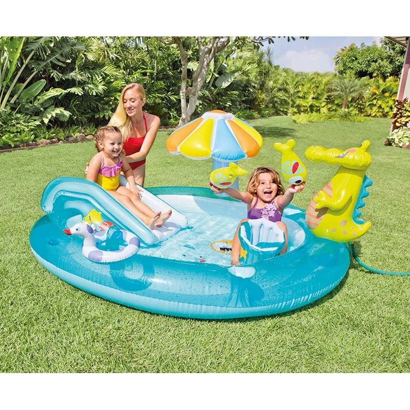 Cette aire de jeux est pleine d’ activités ludiques qui plairont à coup sûr à vos enfants. Ce véritable mini-parc gonflable offre un espace de 2.03m x 1.17m pour que vous puissiez jouer avec vos enfants tout l’été en les rafraîchissant avec la mini fontaine qui se déclenche une fois le tuyau d’arrosage connecté à l’aire de jeux. Les activités offertes, le toboggan ainsi que les animaux gonflables nombreux ne vous laisseront pas le temps de vous ennuyer.C’est une aire de jeux gonflable à la fois spacieuse et ludique