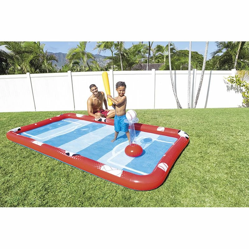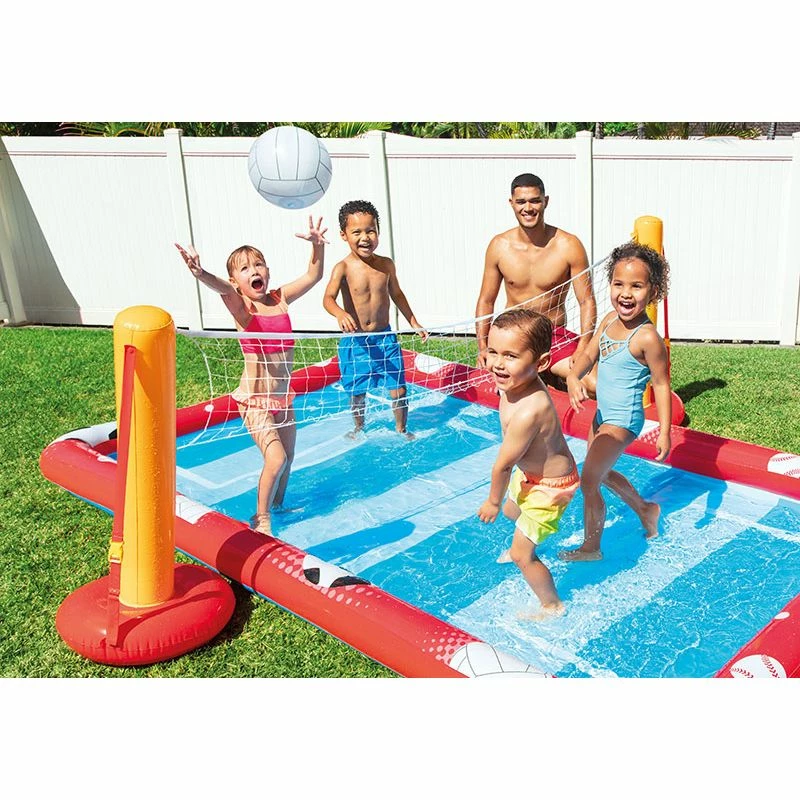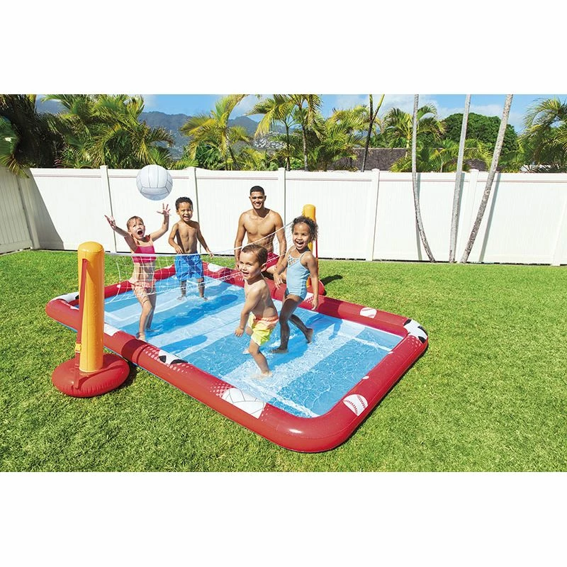Profitez des nombreuses activités ludiques proposées par cette aire de jeux qui plaira à coups sûr aux enfants. Véritable mini terrain de sport gonflable, il offre à vos enfants un rafraîchissement sportif au coeur de l’été tout en partageant avec vous complicité et divertissement. Les activités et accessoires inclus sont tous des éléments des univers sportifs suivants : Football, Volleyball, Baseball.