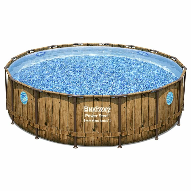 La piscine ronde Power Steel Swim Vista Pool fabriquée par Bestway est un modèle incontournable et innovant intégrant un accessoire nouveau et inédit : le hublot. Avec des dimensions parfaitement adaptées à la plupart des jardins de 4,88 x h.1,22m, et un look tendance au motif bois, vous embellirez votre jardin et profiterez d’un point d’eau accueillant au design soigné et très ludiques grâce aux hublots qui font partie intégrante de son liner.