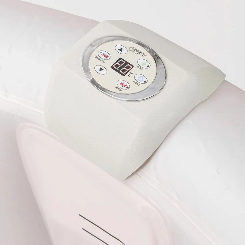 Un panneau de commande utile se doit d’être accessible sans quitter le bassin et il doit être simple d’utilisation. Ubbink propose sur sa gamme Infinite un panneau de contrôle design et ergonomique disposé sur le dessus du bloc de filtration caché à l’intérieur de la paroi gonflable du spa. Grâce à lui, vous profiterez d’un fonctionnement plus discret et silencieux avec le moins d’encombrement car il n’y aura pas de bloc disgracieux à disposer autour du spa. Étanche, ce panneau de contrôle digital est utilisable les mains mouillées pour commander les différentes fonctions à votre disposition pendant votre séance de spa :